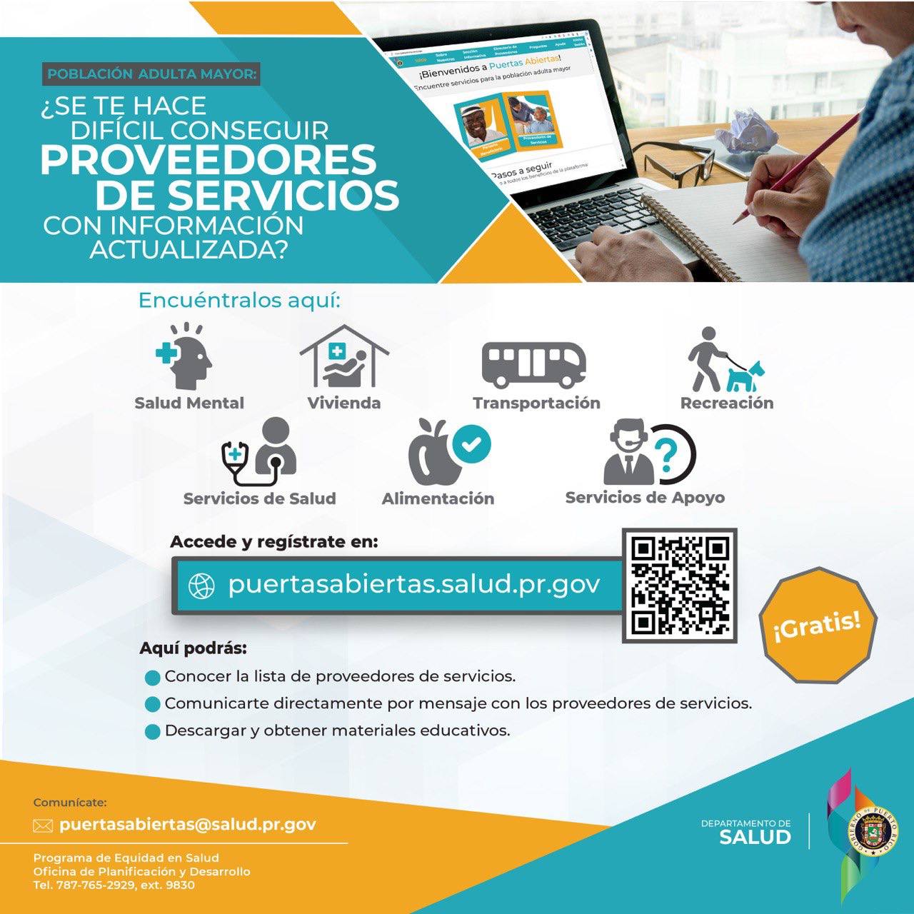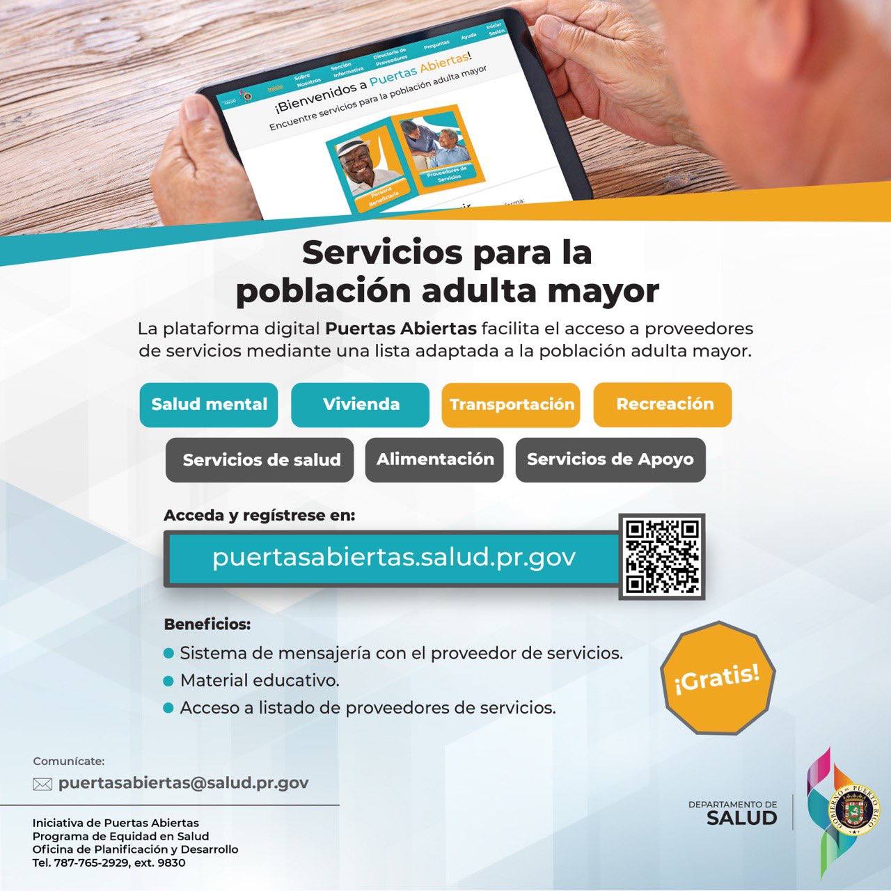 A través de Puertas Abiertas, los usuarios podrán registrarse fácilmente y encontrar información detallada sobre proveedores especializados en el cuidado de adultos mayores. La plataforma también incluye un directorio completo de servicios, como asistencia domiciliaria, transporte, alimentación y actividades recreativas. Además, ofrece material educativo y la posibilidad de compartir información sobre proveedores con otros usuarios. Para acceder a la plataforma, visita: http://puertasabiertas.salud.pr.gov.