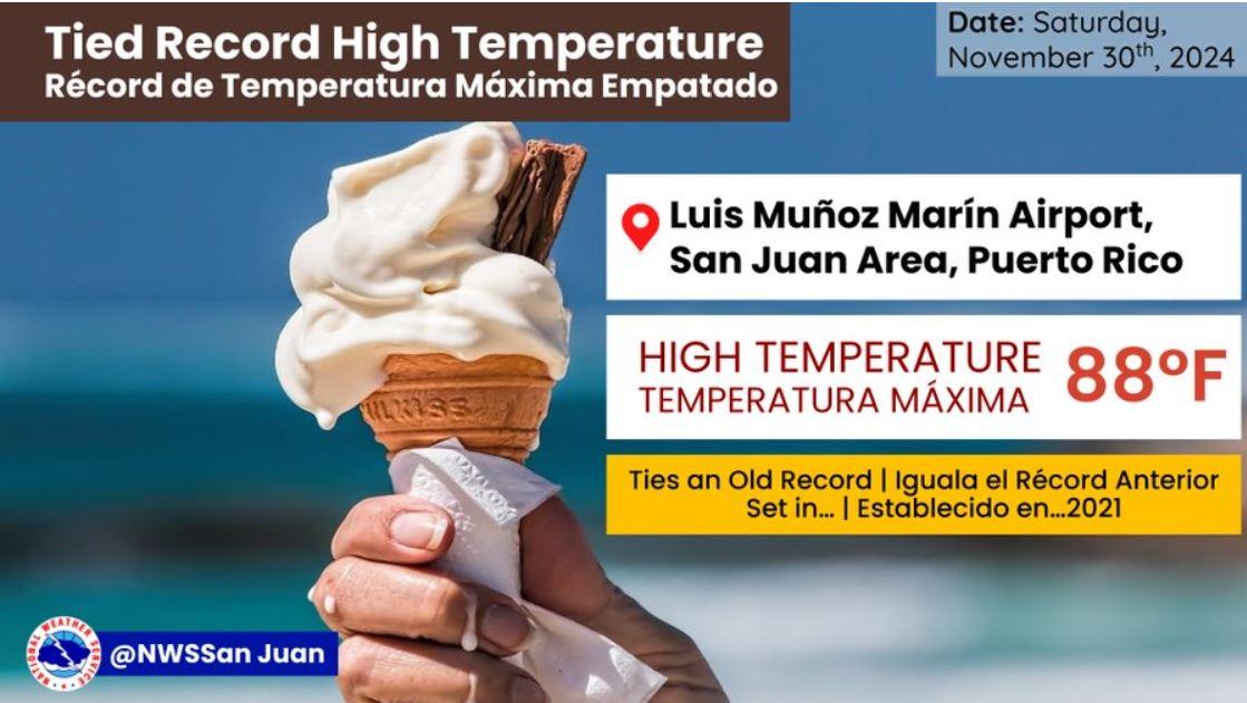 (CyberNews)- El Servicio Nacional de Meteorología informó que, en la noche del viernes, se igualó el récord de alta temperatura máxima diaria en el Aeropuerto Luis Muñoz Marín en Carolina.
