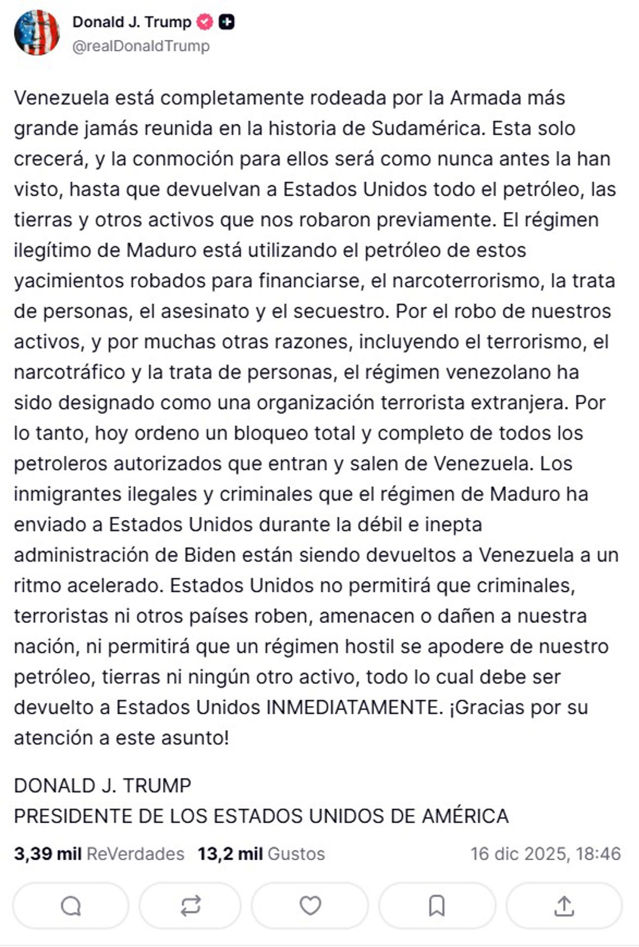 El republicano anunció de esta forma el «bloqueo total» contra los petroleros que entren y salgan de Venezuela, en una escalada importante del operativo militar que inició en las aguas internacionales del Caribe que supuestamente tenía como objetivo central combatir a organizaciones del narcotráfico que operan en la región.