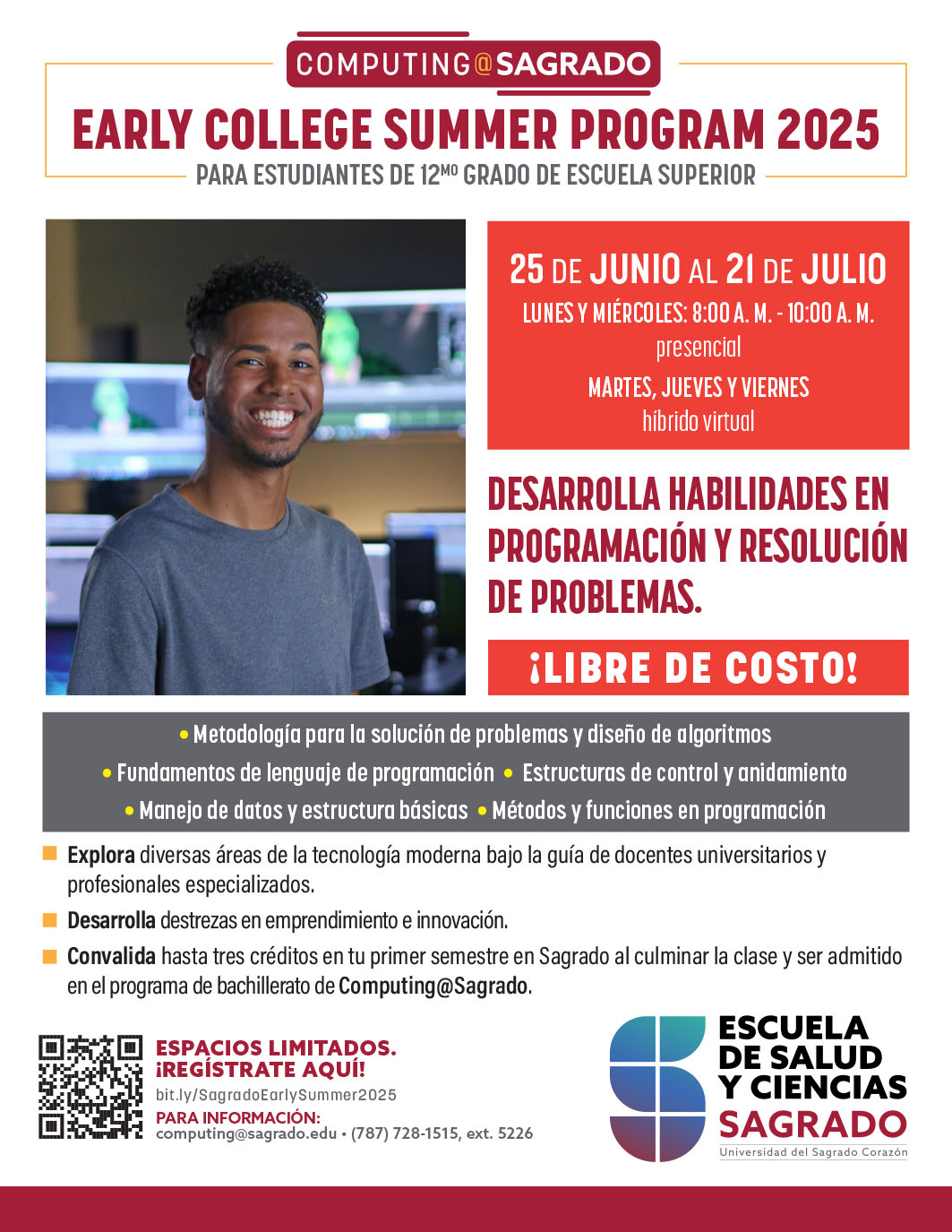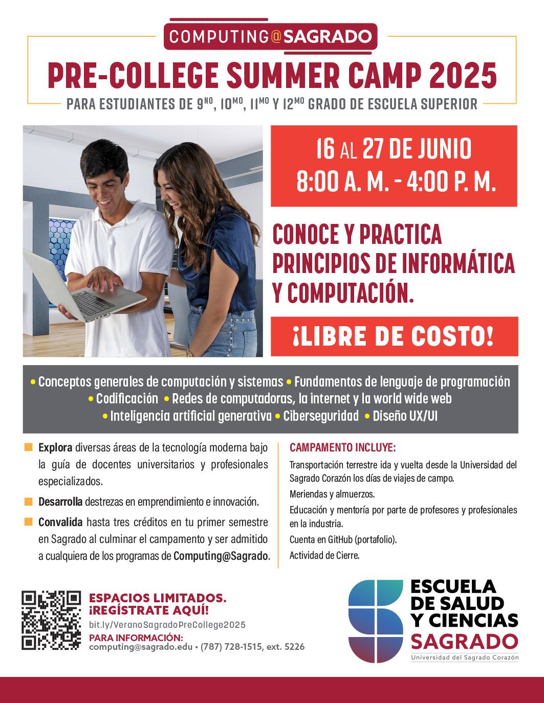 Dirigido a estudiantes de 9no a 12mo grado que tengan interés en el mundo de la tecnología. Durante dos semanas, los participantes desarrollarán destrezas en ciencias de cómputos a través de talleres prácticos, adiestramientos especializados y visitas a empresas líderes en el sector tecnológico. Además, recibirán mentoría directa de profesores universitarios y profesionales de la industria. Como beneficio adicional, los participantes podrán convalidar hasta 3 créditos universitarios si deciden continuar sus estudios en alguno de los programas de Computing@Sagrado. Se llevará a cabo del 16 al 27 de junio, en horario de 8:00 a.m. a 4:00 p.m. y es libre de costo.
