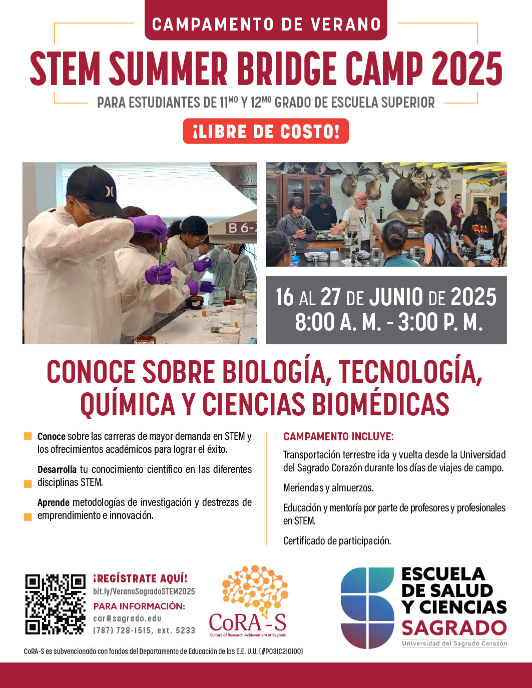 Dirigido a estudiantes de 11mo y 12mo grado, este campamento se realizará en horario de 8:00 a. m. a 3:00 p. m. y permitirá a los participantes explorar el fascinante mundo de las ciencias, la tecnología y matemáticas mediante actividades prácticas, charlas y visitas educativas a diversas organizaciones. Este campamento ofrece la oportunidad de ampliar conocimientos en STEM y conocer las opciones académicas de la Escuela de Salud y Ciencias de la Universidad del Sagrado Corazón.