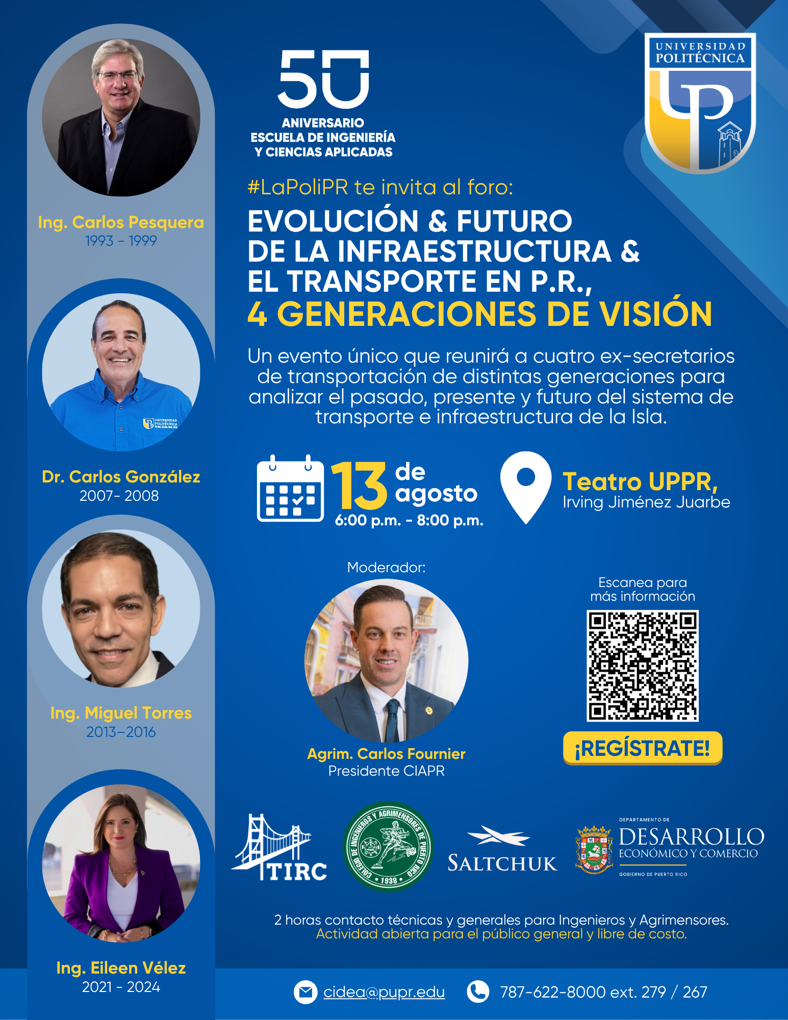 El foro, titulado “Evolución y Futuro de la Infraestructura & Transporte en Puerto Rico: 4 Generaciones de Visión”, se llevará a cabo el miércoles, 13 de agosto de 2025, a las 6:00 p.m. en el Teatro de la Universidad Politécnica de Puerto Rico, en Hato Rey. La entrada será libre y abierta al público.