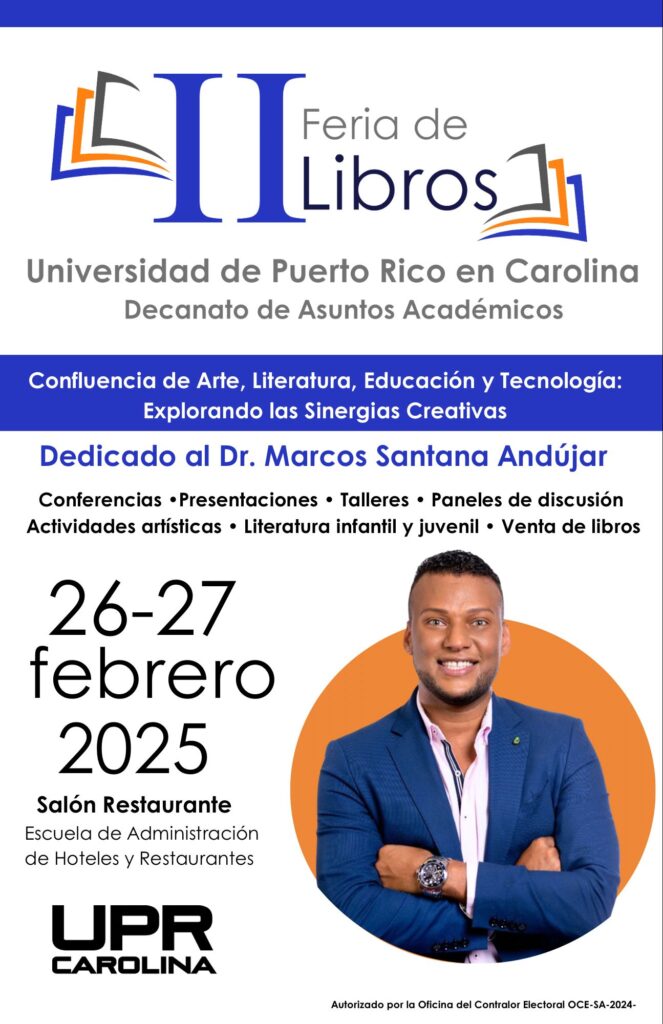 La Universidad de Puerto Rico en Carolina llevará a cabo la segunda edición de la Feria del Libro, titulada “Confluencia de Arte, Literatura, Educación y Tecnología: Explorando las Sinergias Creativas”. El evento se realizará los días 26 y 27 de febrero de 2025, en el Centro de Recursos para el Aprendizaje José P. Fernández Miranda (Biblioteca), en horario de 9:00 a.m. a 8:00 p.m.
