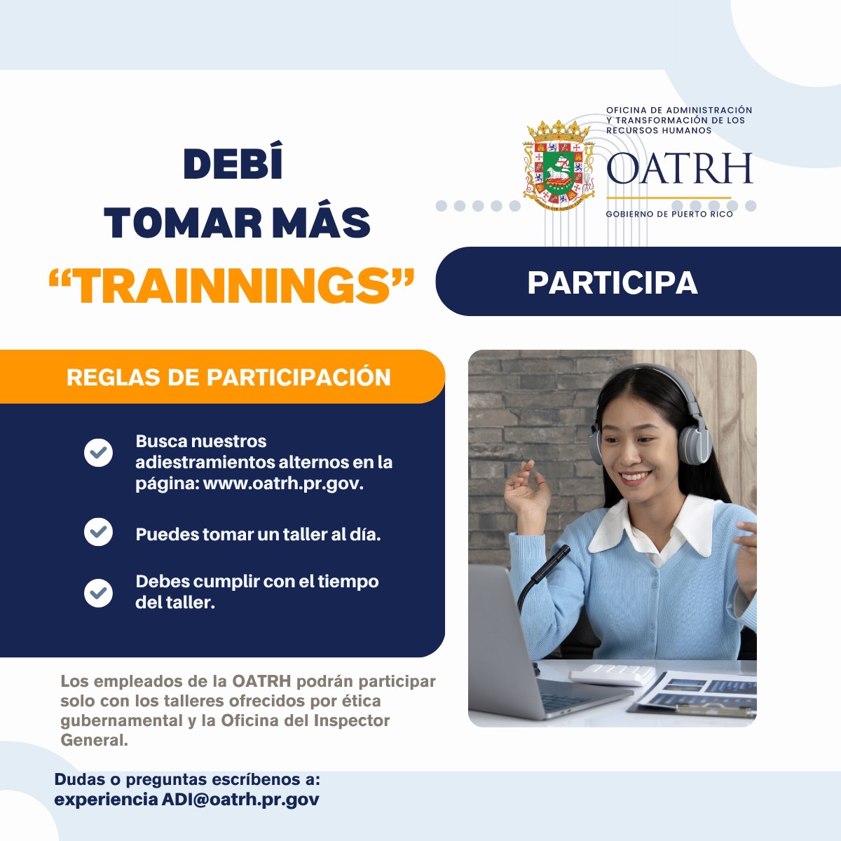 “Debí tomar más trainings” no es solo una campaña educativa; es también una manifestación de la visión transformadora de la OATRH, que apuesta por el uso de la tecnología, la innovación y la educación continua como pilares para construir un gobierno ágil, moderno y comprometido con ofrecer servicios de excelencia a la ciudadanía. El Director de la OATRH, Lcdo. Facundo Miguel Di Mauro Vázquez, destacó la importancia de esta iniciativa al señalar que, “este esfuerzo refleja nuestro compromiso con el desarrollo continuo de los empleados del Gobierno de Puerto Rico. Queremos que el aprendizaje sea significativo, accesible y motivador. A través de estos talleres, reforzamos nuestra visión de un servicio público preparado, productivo y orientado al bienestar, todo mientras premiamos la participación con una oportunidad única de asistir a un evento de gran impacto. Capacitarse hoy es invertir en el futuro del servicio público”. Para dudas o información adicional, los empleados públicos pueden escribir al correo electrónico experienciaADI@oatrh.pr.gov.
